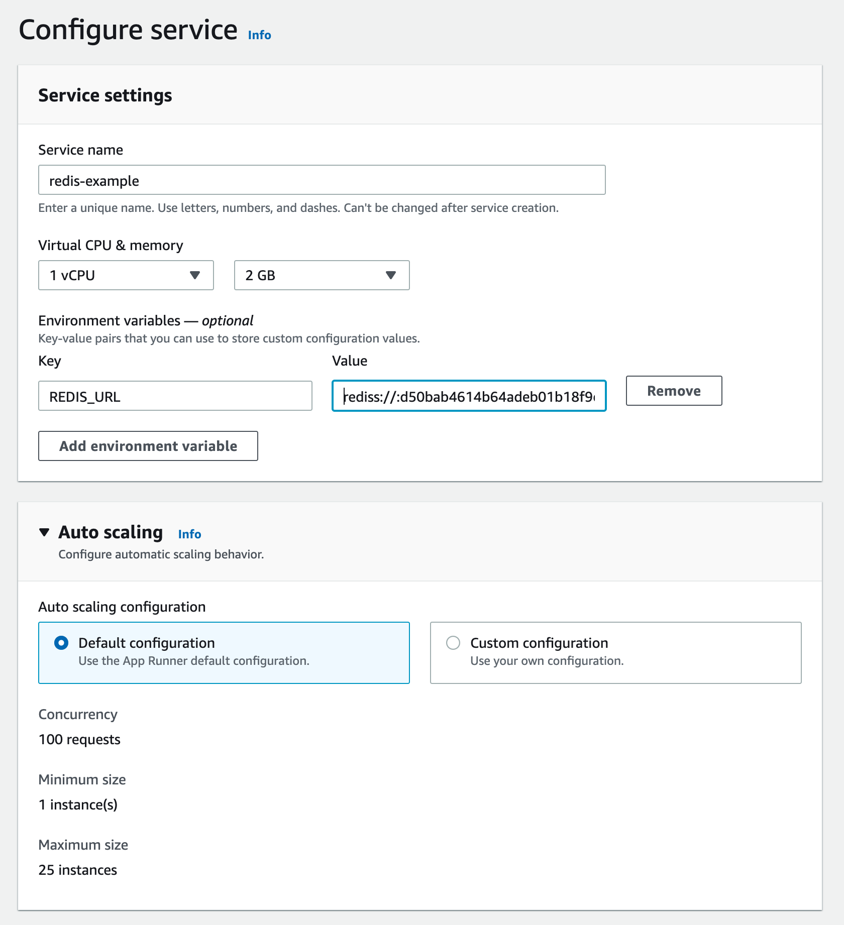 The next page configures your App Runner service. Set a name for your service. Set your Redis URL that you copied from Upstash console as REDIS_URL environment variable. Your Redis URL should be something like this: rediss://:d34baef614b6fsdeb01b25@us1-lasting-panther-33618.upstash.io:33618 You can leave other settings as default.